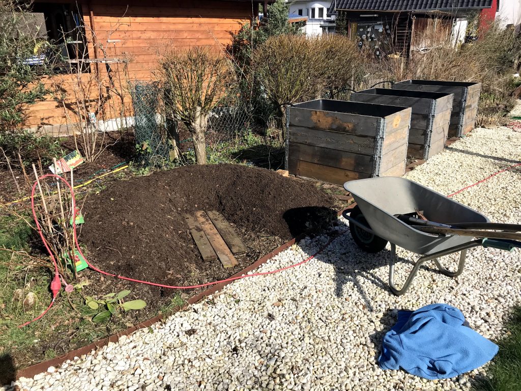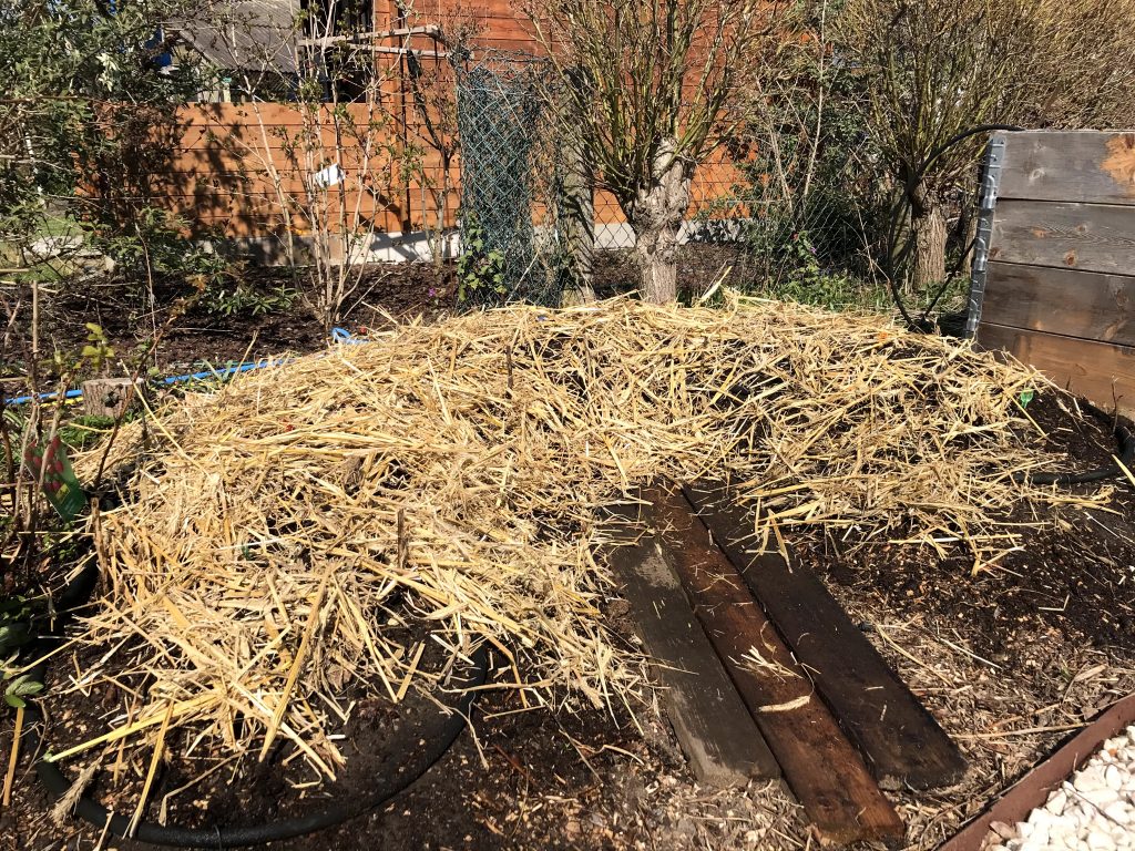 Sieht ganz gut aus, kann also ab in’s Beet gehen mit den Kartoffeln. 10cm tief, die Augen nach oben, Abstand 40-60cm. Vorher habe ich noch auf dem Rundbeet eine Tropfbewässerung verlegt, der Boden ist schon wieder sehr am austrocknen. Und oben drauf kommt ne Lage Stroh – obwohl so viel ist es leider nicht, was ich da gefunden habe…